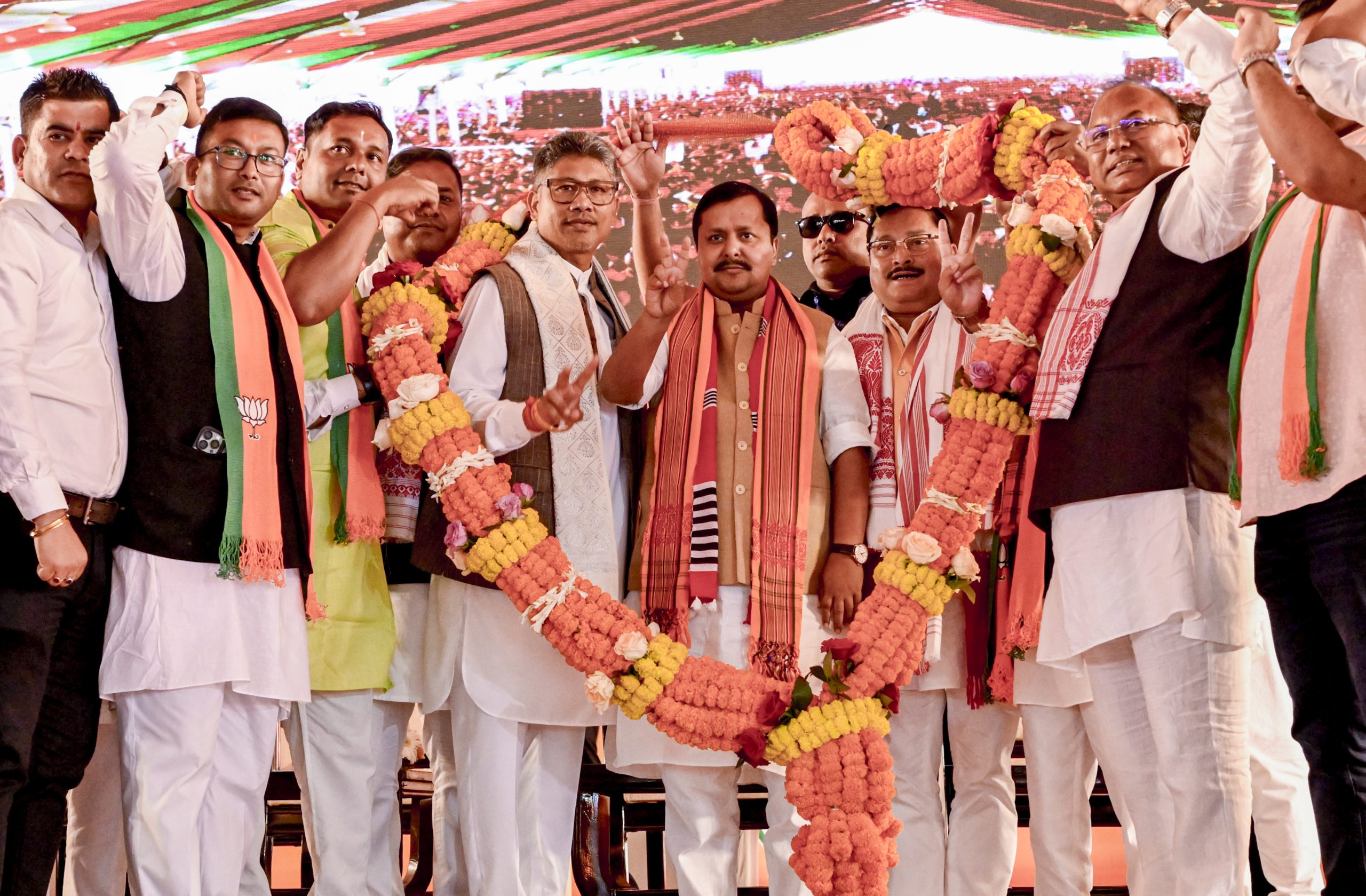 Morigaon: BJP National President Nitin Nabin, centre, along with Assam BJP President Dilip Saikia and BJP candidate from Jagiroad Assembly constituency Pijush Hazarika being garlanded by supporters during a public rally ahead of the Assam Assembly Election, in Morigaon district, Monday, March 30, 2026. (PTI Photo)(PTI03_30_2026_000294B)