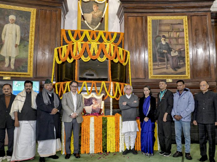 **EDS: THIRD PARTY IMAGE** In this image received on Jan. 23, 2026, Union Minister Kiren Rijiju, Congress President Mallikarjun Kharge, Congress leader Jairam Ramesh and others at a function to pay floral tributes to Netaji Subhas Chandra Bose on the occasion of his birth anniversary, in New Delhi. (PIB via PTI Photo) (PTI01_23_2026_000455B)