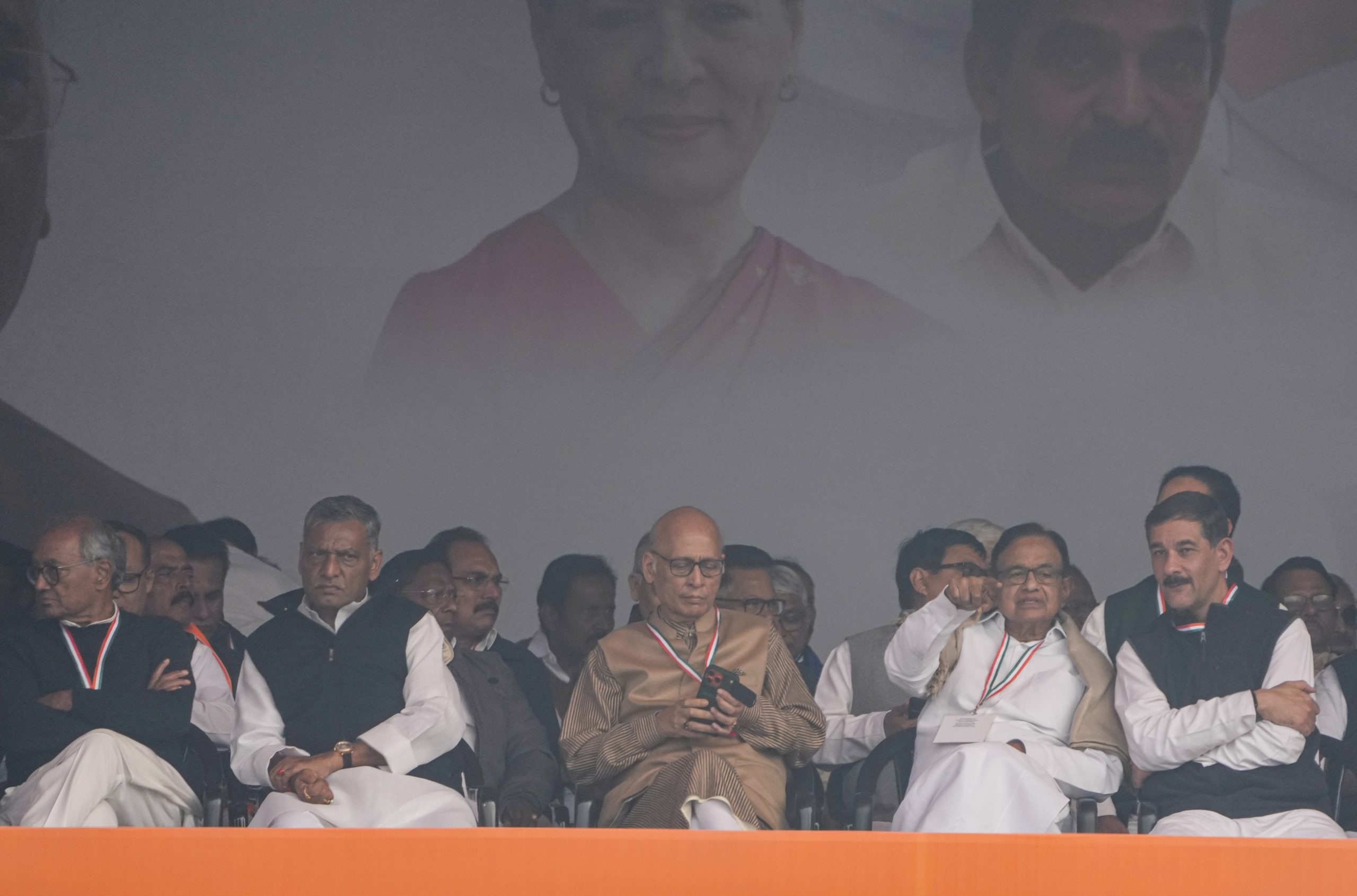 New Delhi: Front row from left, Congress leaders Digvijaya Singh, Akhilesh Prasad Singh, Abhishek Manu Singhvi, P Chidambaram and Jitendra Singh during the party's 'Vote Chor, Gaddi Chhod' rally at Ramlila Ground, in New Delhi, Sunday, Dec. 14, 2025. (PTI Photo/Atul Yadav) (PTI12_14_2025_000204B)