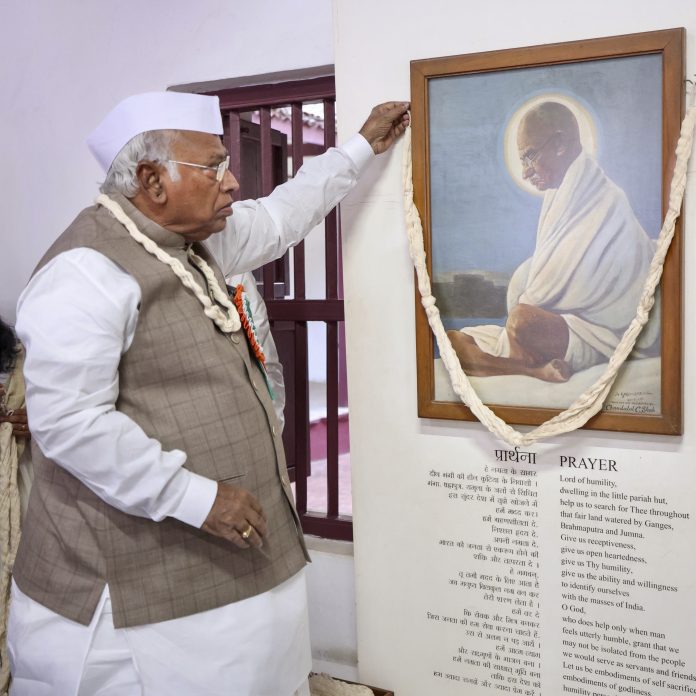 **EDS: THIRD PARTY IMAGE** In this image by AICC on Tuesday, April 8, 2025, Congress President Mallikarjun Kharge pays tribute to a portrait of Mahatma Gandhi at the Sabarmati Ashram, in Ahmedabad. (AICC via PTI Photo)(PTI04_08_2025_000530B)