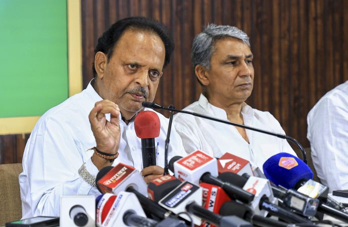 Jaipur: Congress leader Raghu Sharma, left, addresses a press conference, in Jaipur, Thursday, March 26, 2026. (PTI Photo) (PTI03_26_2026_000215B)