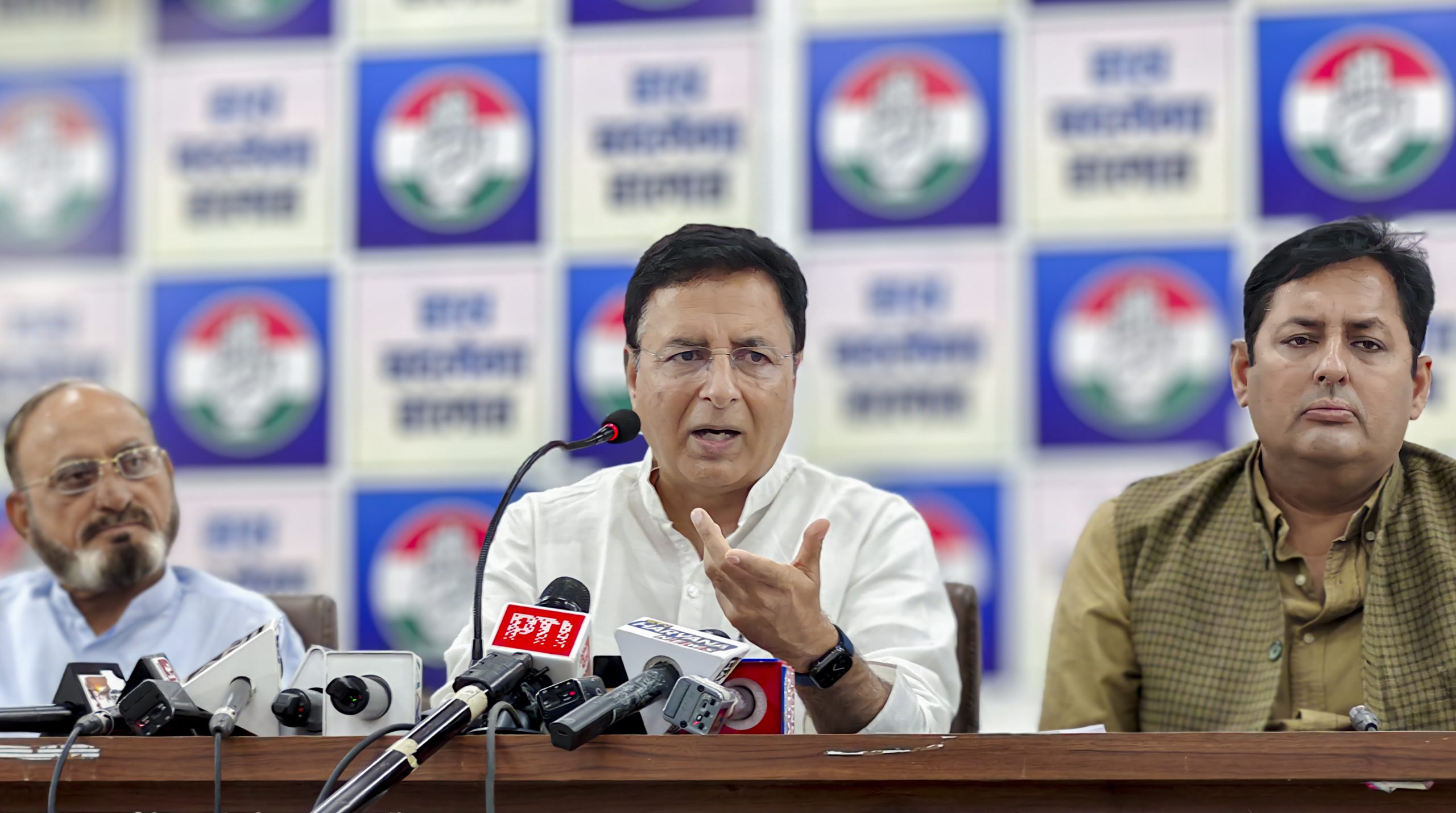 Chandigarh: Congress leader Randeep Singh Surjewala addresses a press conference, in Chandigarh, Sunday, March 29, 2026. (PTI Photo) (PTI03_29_2026_000277B)