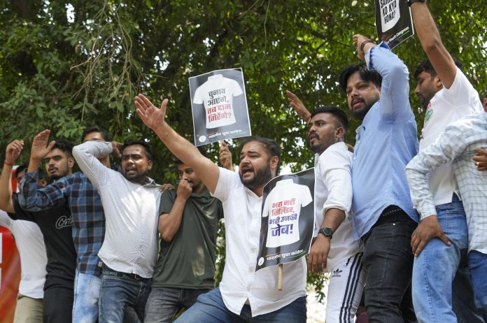 New Delhi: Indian Youth Congress workers raise slogans during a protest against hike in the prices of petrol, diesel and cooking gas, in New Delhi, Saturday, April 12, 2025. (PTI Photo/Arun Sharma) (PTI04_12_2025_000100B)