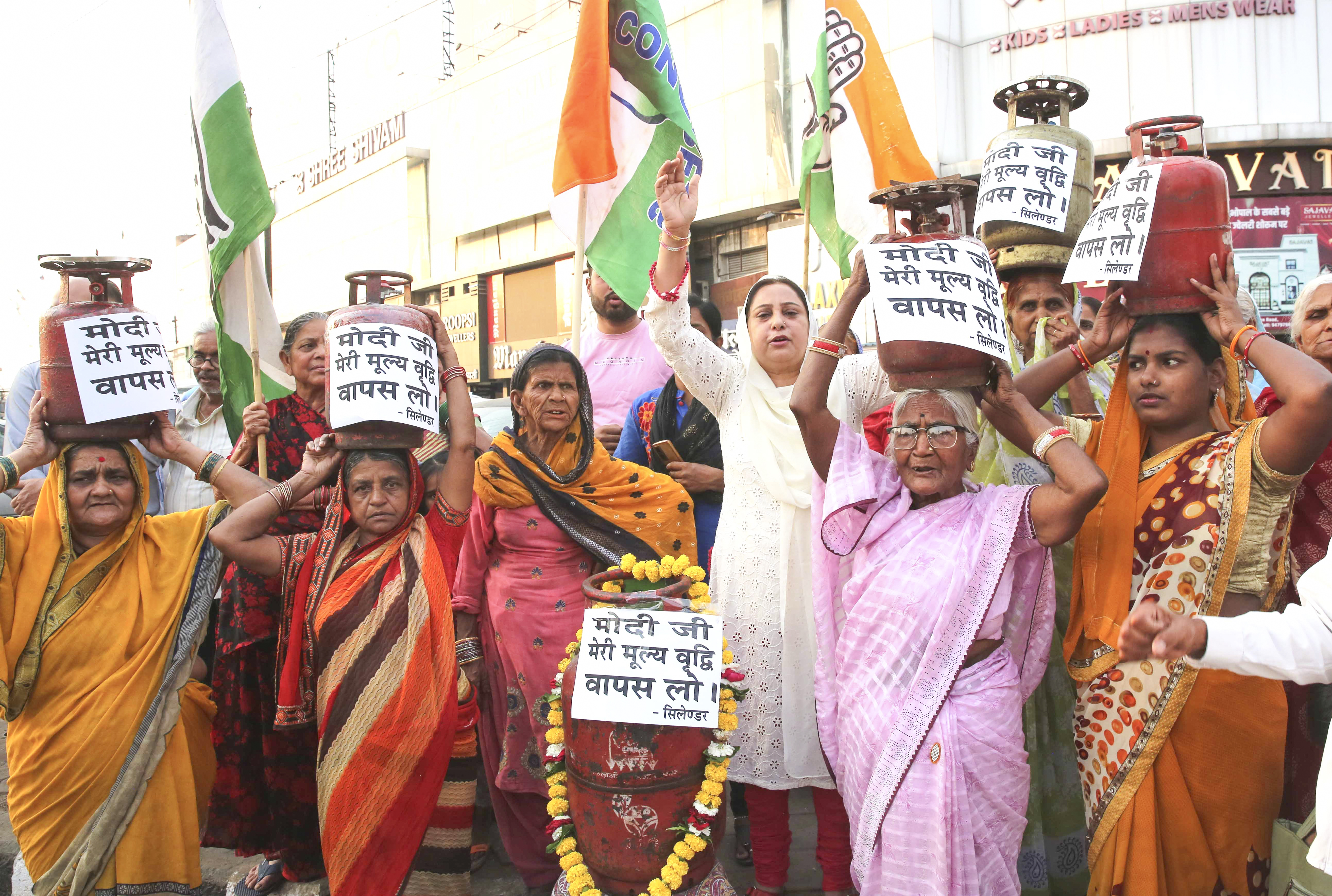Bhopal: Congress workers stage a protest against the hike in LPG cylinders, in Bhopal, Tuesday, April 8, 2025. The government on Monday hiked the cooking gas price by Rs 50 per cylinder. (PTI Photo)(PTI04_08_2025_000531B)