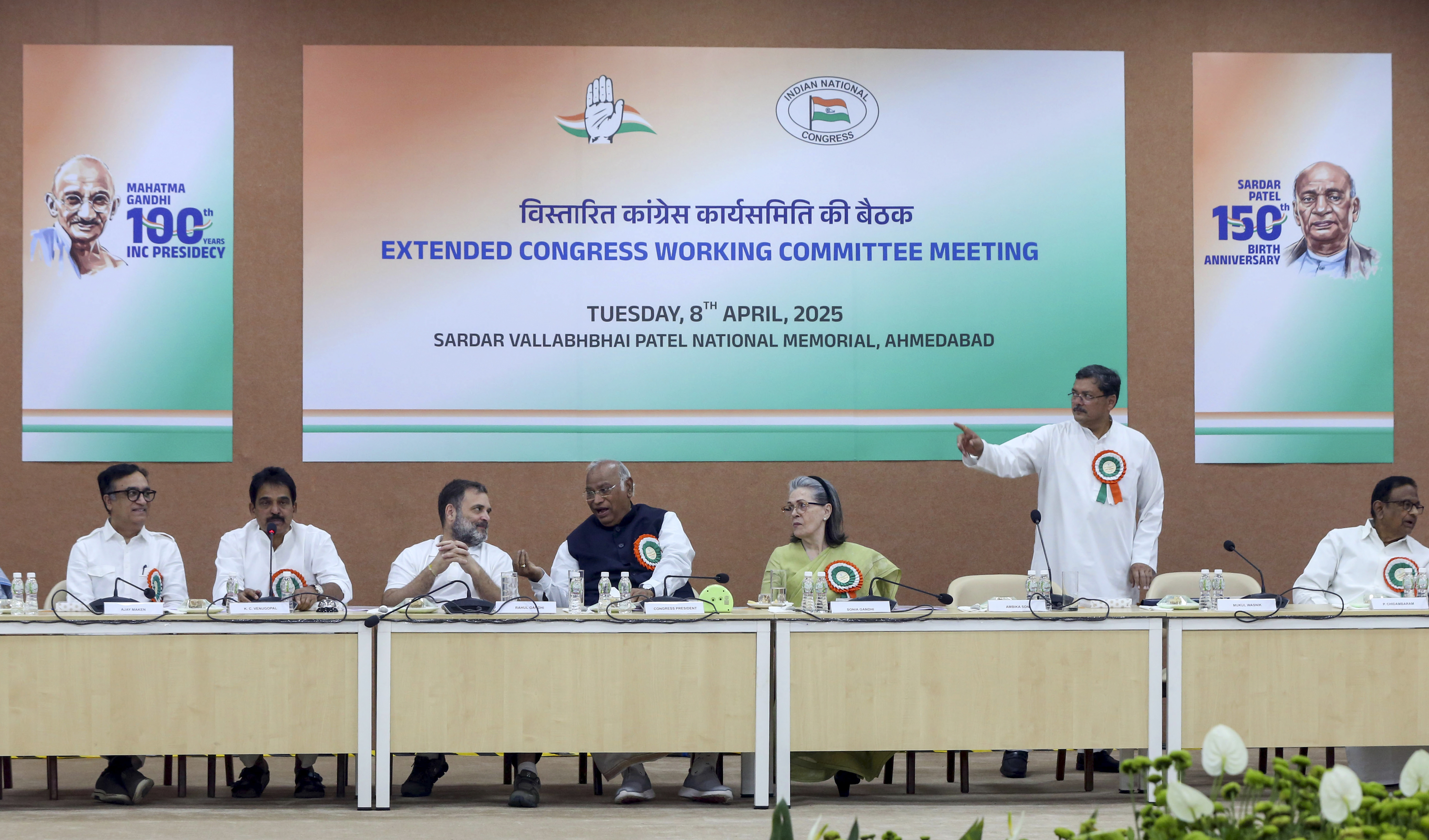 Ahmedabad: Congress President Mallikarjun Kharge, Congress Parliamentary Party chairperson Sonia Gandhi, LoP in Lok Sabha Rahul Gandhi and others during the extended Congress Working Committee (CWC) meeting, at Sardar Vallabhbhai Patel Memorial, in Ahmedabad, Tuesday, April 8, 2025. (PTI Photo)(PTI04_08_2025_000136B)