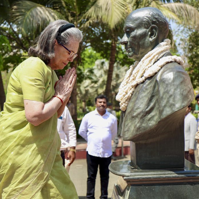 **EDS: THIRD PARTY IMAGE** In this image released by @kcvenugopalmp via X on April 8, 2025, Congress Parliamentary Party chairperson Sonia Gandhi pays tribute to Sardar Vallabhbhai Patel upon her arrival to attend the extended Congress Working Committee (CWC) meeting, at Sardar Vallabhbhai Patel Memorial, in Ahmedabad. (@kcvenugopalmp via PTI Photo)(PTI04_08_2025_000190B)