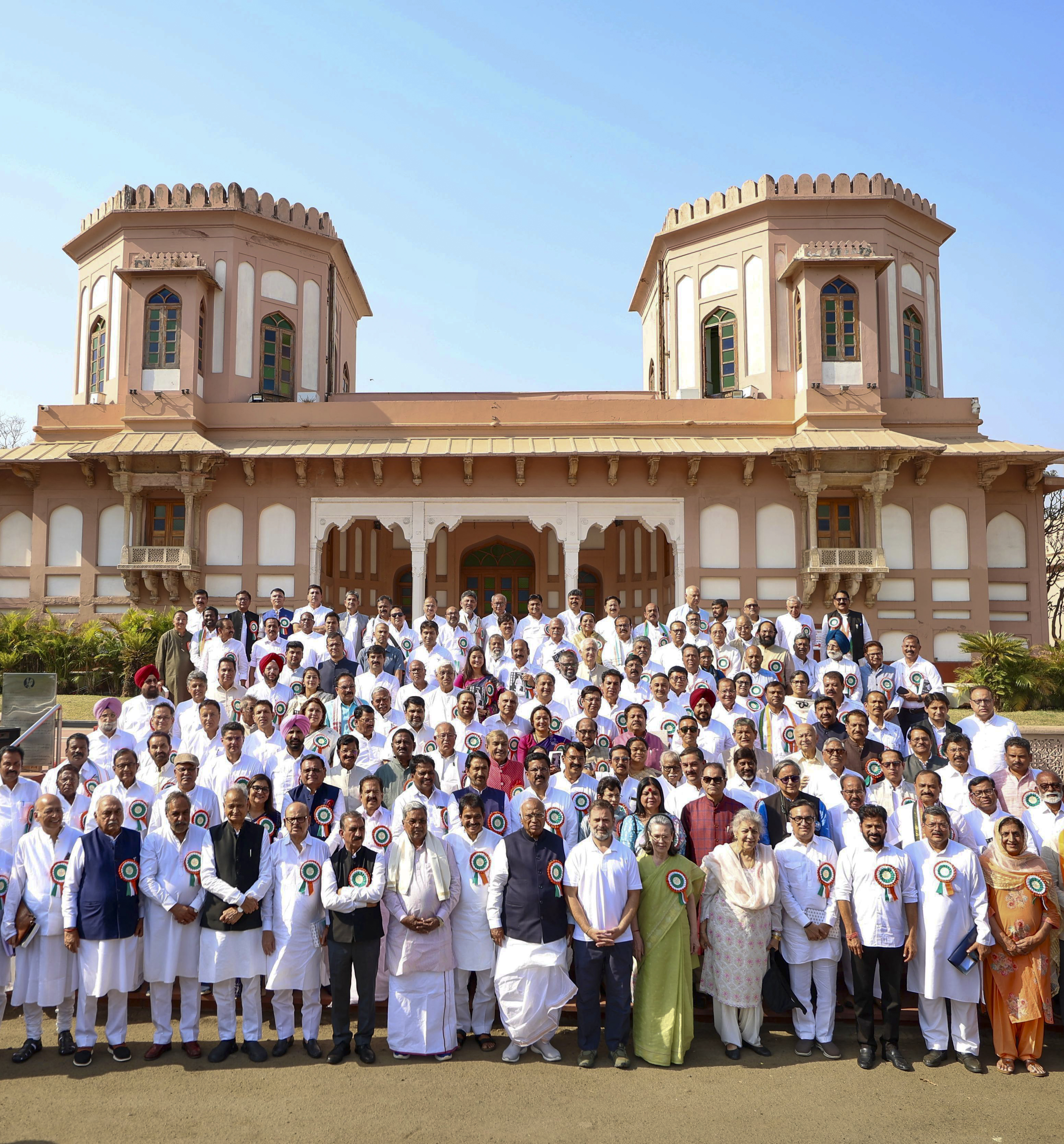 **EDS: THIRD PARTY IMAGE** In this image via AICC on April 8, 2025, Congress President Mallikarjun Kharge, Congress Parliamentary Party chairperson Sonia Gandhi, LoP in Lok Sabha Rahul Gandhi and others pose for a group photograph after the extended Congress Working Committee (CWC) meeting, at Sardar Vallabhbhai Patel Memorial, in Ahmedabad. (AICC via PTI Photo)(PTI04_08_2025_000291B)