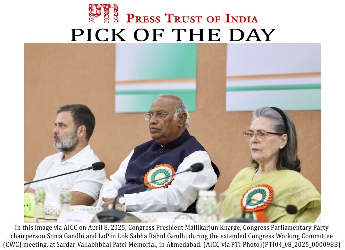 **EDS: THIRD PARTY IMAGE** In this image via AICC on April 8, 2025, Congress President Mallikarjun Kharge, Congress Parliamentary Party chairperson Sonia Gandhi and LoP in Lok Sabha Rahul Gandhi during the extended Congress Working Committee (CWC) meeting, at Sardar Vallabhbhai Patel Memorial, in Ahmedabad. (AICC via PTI Photo)(PTI04_08_2025_000098B)(PTI04_08_2025_000573B)