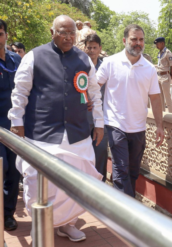 Ahmedabad: Congress President Mallikarjun Kharge with party leader and LoP in Lok Sabha Rahul Gandhi arrives to attend the extended Congress Working Committee (CWC) meeting, at Sardar Vallabhbhai Patel Memorial, in Ahmedabad, Tuesday, April 8, 2025. (PTI Photo)(PTI04_08_2025_000133B)