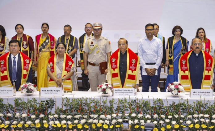 **EDS: THIRD PARTY IMAGE** In this image released by @CMODelhi via X on Friday, April 11, 2025, Delhi LG VK Saxena with Chief Minister Rekha Gupta and Minister Ashish Sood during the 17th convocation of Guru Gobind Singh Indraprastha University, in New Delhi. (@CMODelhi via PTI Photo)