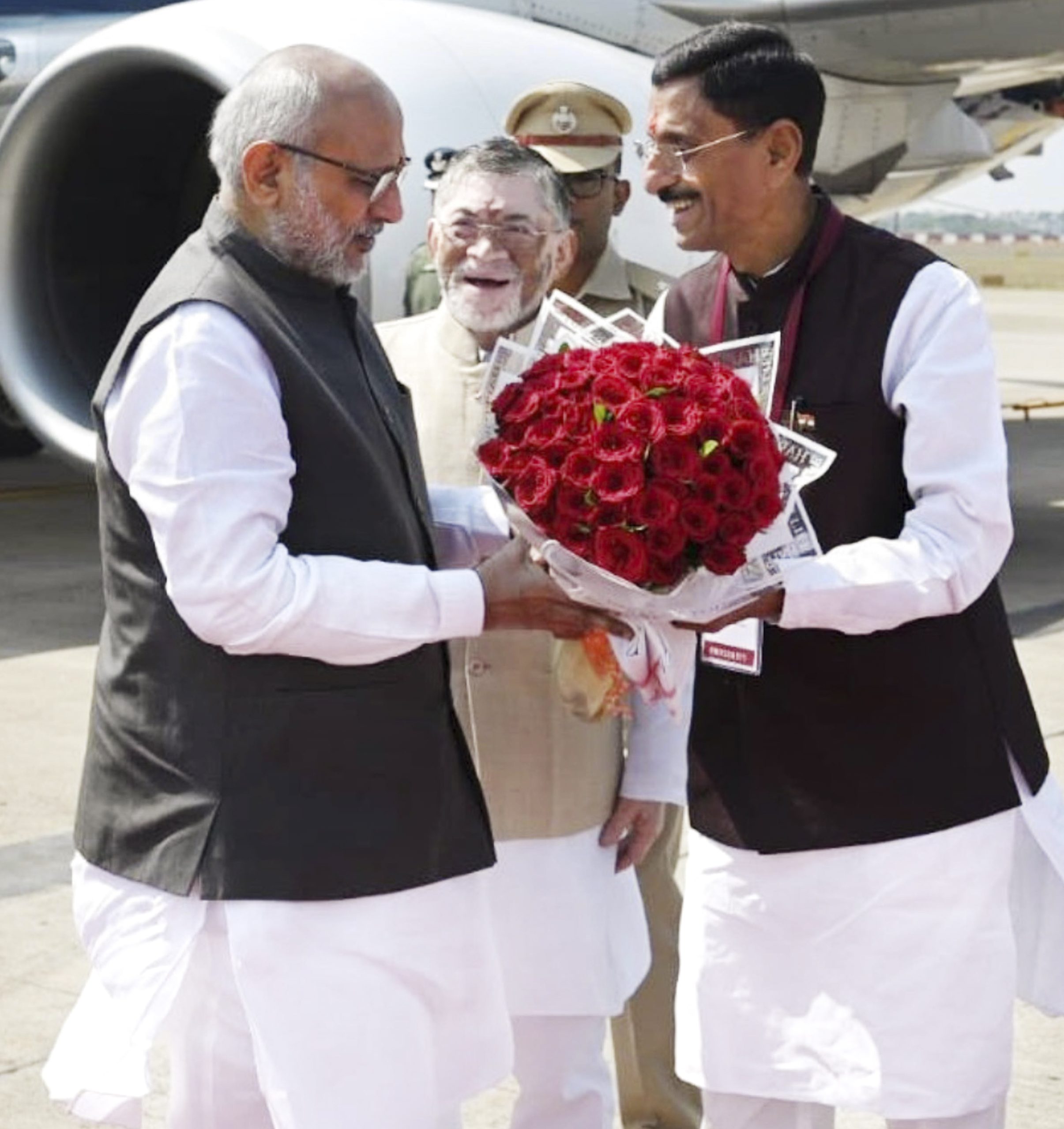 Ranchi: Vice President CP Radhakrishnan, left, being received by Jharkhand Governor Santosh Kumar Gangwar and MoS for Defence Sanjay Seth, at Birsa Munda Airport, in Ranchi, Jharkhand, Saturday, March 28, 2026. (PTI Photo)(PTI03_28_2026_000033B)