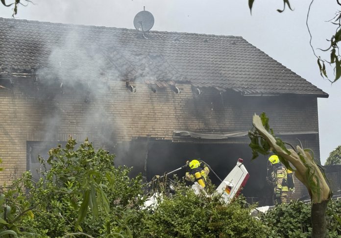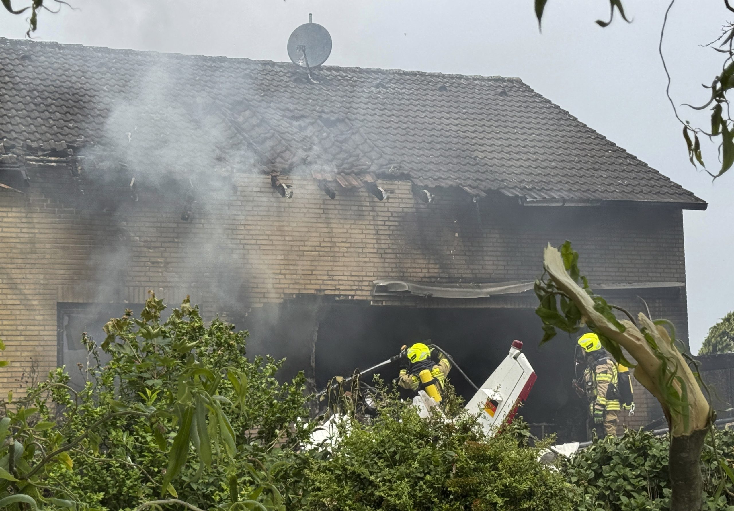 Firefighters work at the crash site after an airplane crashed into a residential building, in Korschenbroich, Germany, Saturday, May 31, 2025. AP/PTI(AP05_31_2025_000262B)