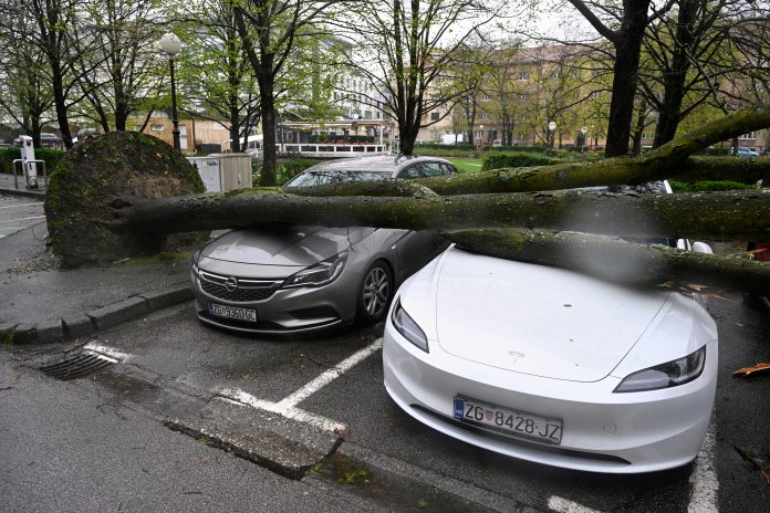 A tree lies on parked cars after strong winds in Zagreb, Croatia, Friday, March 27, 2026. AP/PTI(AP03_27_2026_000309B)