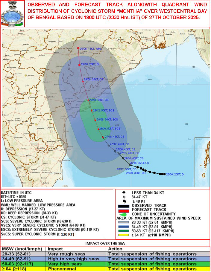 According to the IMD, the storm — named ‘Montha’, a Thai word meaning “fragrant flower” — was centred about 190 km south-southeast of Machilipatnam, 270 km south-southeast of Kakinada, and 340 km south-southeast of Vizag at 5.30 am.
