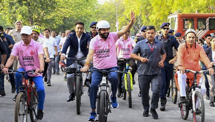 **EDS: THIRD PARTY IMAGE** In this image released by @NayabSainiBJP via X on Friday, Apr. 11, 2025, Haryana CM Nayab Saini take part in a Cyclothon 2.0 Yatra organised with the resolve to make Haryana drug-free, in Faridabad. (@NayabSainiBJP via PTI Photo) (PTI04_11_2025_000131B) *** Local Caption ***