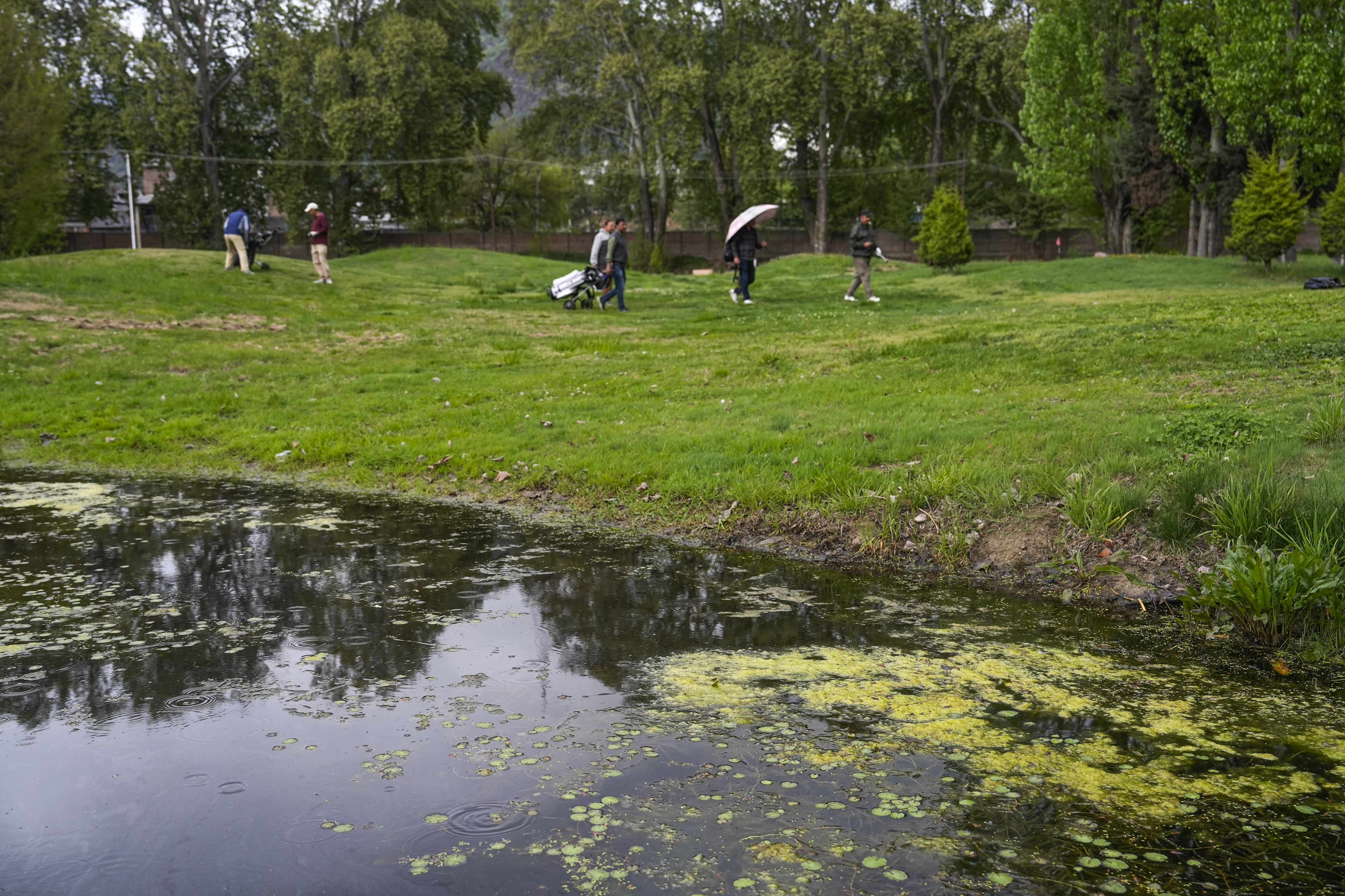 Srinagar: Golfers walk by a water body full of algae, at the historical Kashmir Golf Course in Srinagar, Wednesday, April 16, 2025. Members allege that the Kashmir Golf Course, located in the heart of the capital, is facing major neglect, due to a lack of staff and damaged irrigation facilities. (PTI Photo/S Irfan) (PTI04_18_2025_000110B) *** Local Caption ***
