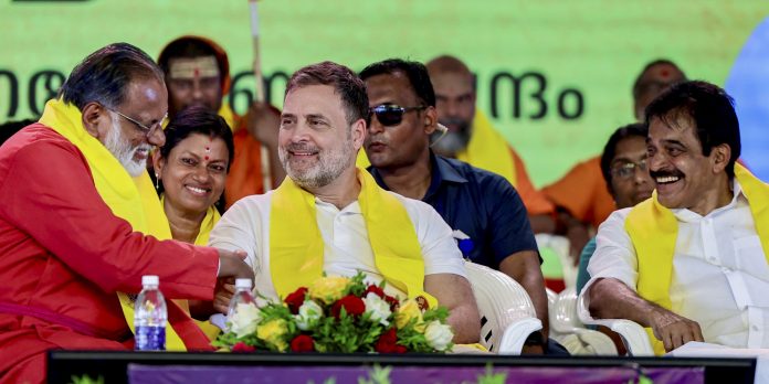 **EDS: THIRD PARTY IMAGE** In this image received on March 6, 2026, Leader of Opposition in the Lok Sabha and Congress MP Rahul Gandhi, centre, with party MP KC Venugopal, right, and others during an event commemorating the centenary of Mahatma Gandhi's meeting with reformist saint Sree Narayana Guru, in Kollam, Kerala. (AICC via PTI Photo)(PTI03_06_2026_000200B)