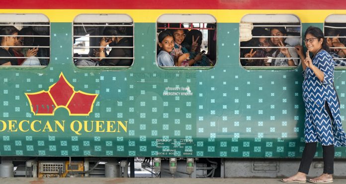 Mumbai: Passengers show a victory sign while boarding the Deccan Queen train, marking 95 years of service, at CSMT in Mumbai, Friday, March 27, 2026. (PTI Photo/Shashank Parade)(PTI03_27_2026_000361B)