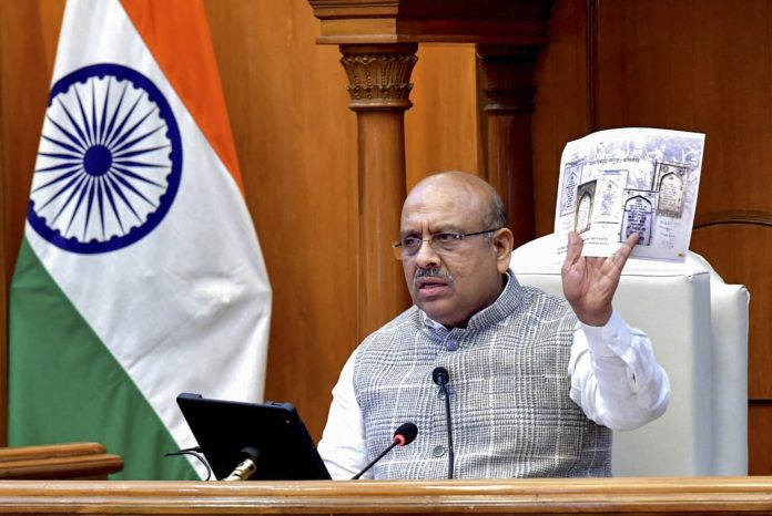 **EDS: THIRD PARTY IMAGE** In this image received on March 27, 2026, Delhi Assembly Speaker Vijender Gupta conducts the proceedings during the Budget Session of the Delhi Legislative Assembly, in New Delhi. (Handout via PTI Photo) (PTI03_27_2026_000354B)
