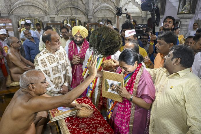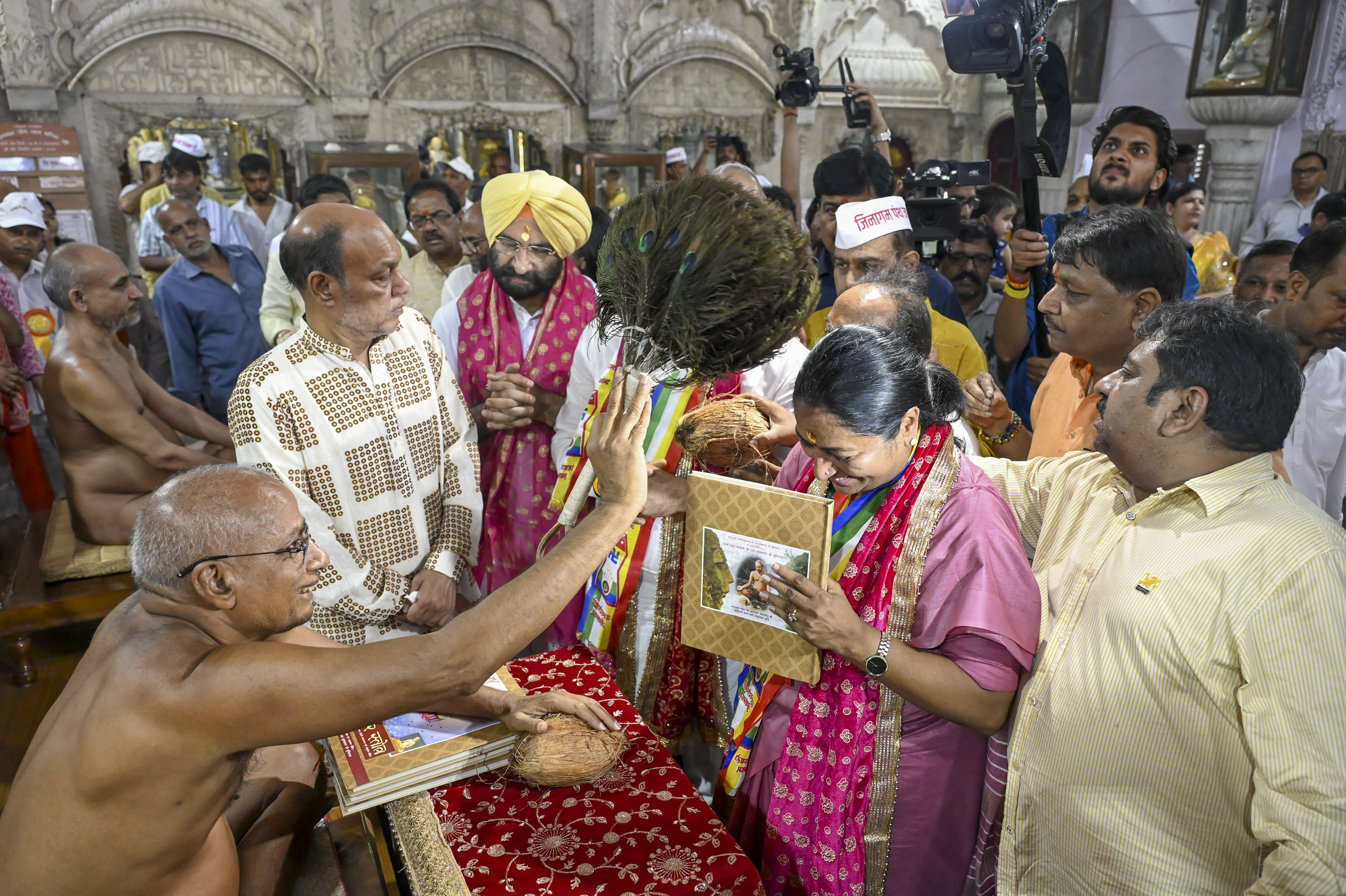 New Delhi: Delhi Chief Minister Rekha Gupta with state Minister Manjinder Singh Sirsa and others during a visit to Sri Digambar Jain Lal Mandir on the occasion of �Mahavir Jayanti�, in New Delhi, Thursday, April 10, 2025. (PTI Photo) (PTI04_10_2025_000217B)