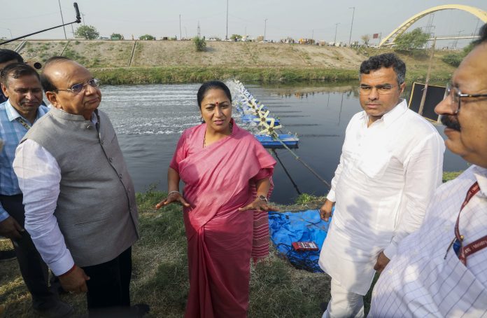 New Delhi: Delhi Lt. Governor Vinai Kumar Saxena, Chief Minister Rekha Gupta and Minister Parvesh Verma during a joint inspection of the supplementary drain at Wazirabad, in New Delhi, Thursday, Apr. 10, 2025. (PTI Photo) (PTI04_10_2025_000036B) *** Local Caption ***