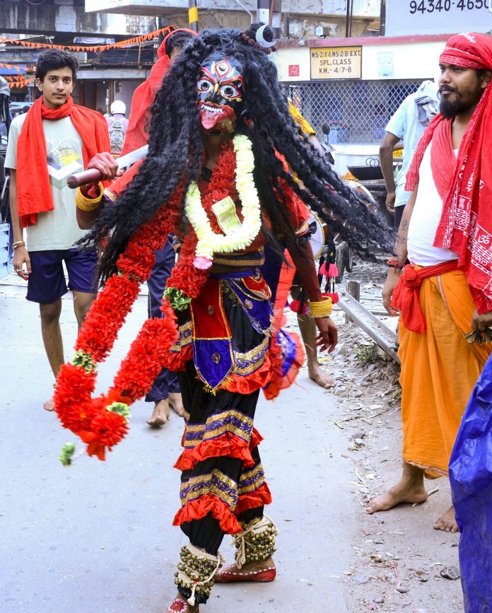 Siliguri: A devotee dressed as Goddess Kali ahead of the ‘Charak’ ritual that is observed on the last day of the Bengali calender year, in Siliguri, West Bengal, Tuesday, April 8, 2025. (PTI Photo)(PTI04_08_2025_000457B)
