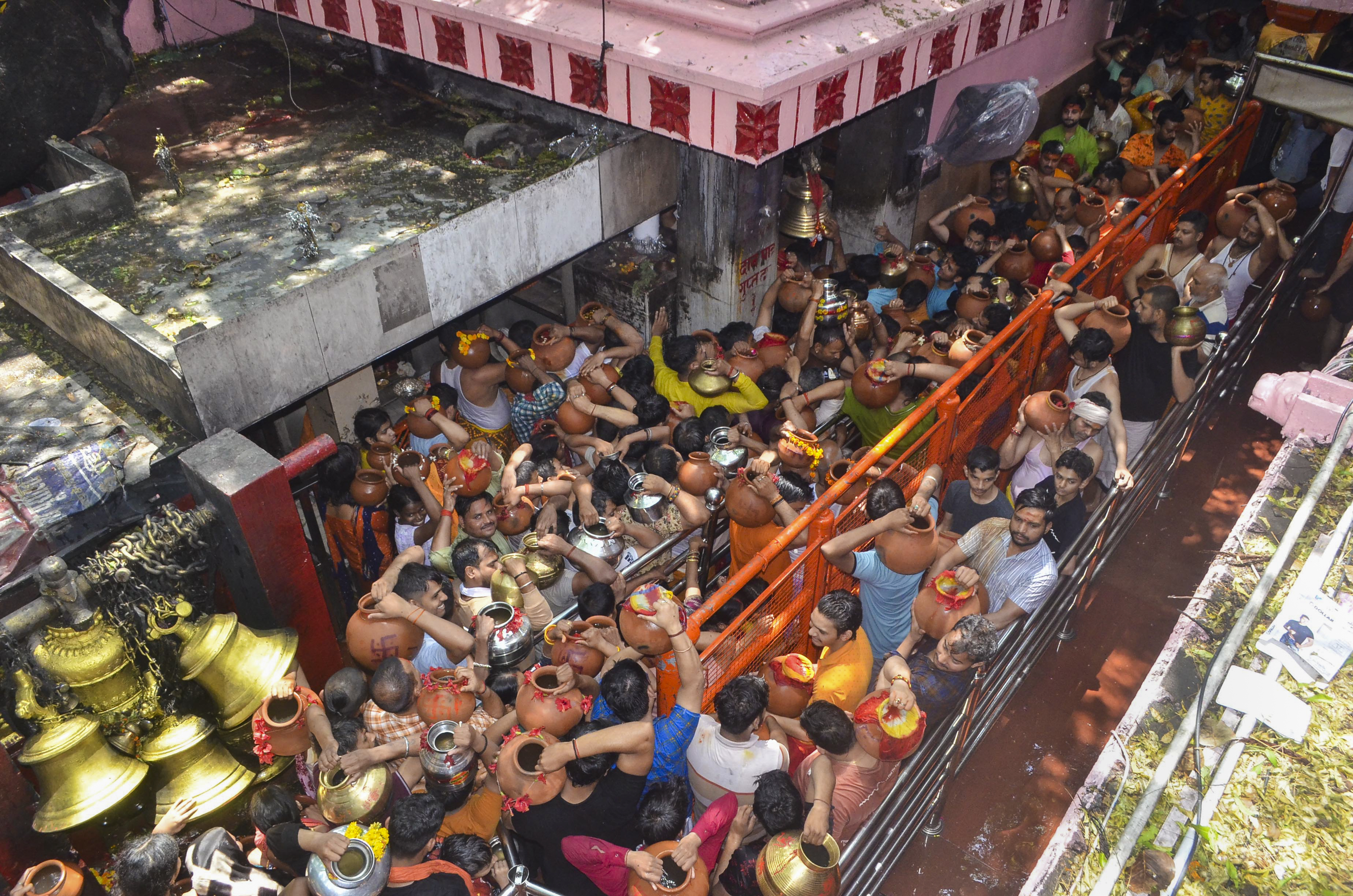 Mirzapur: Devotees carrying holy water of River Ganga wait in queues to perform worship of Vindhyavasini Devi on occasion of Nikashi Puja festival at Vindhyachal Dham, in Mirzapur, Sunday, April 13, 2025. (PTI Photo) (PTI04_13_2025_000110B)