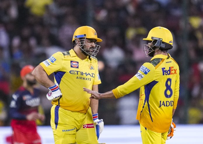Bengaluru: Chennai Super Kings' MS Dhoni and Ravindra Jadeja during the Indian Premier League (IPL) 2025 cricket match between Royal Challengers Bengaluru and Chennai Super Kings, at M Chinnaswamy Stadium in Bengaluru, Saturday, May 3, 2025. (PTI Photo/Shailendra Bhojak)(PTI05_03_2025_000591B)