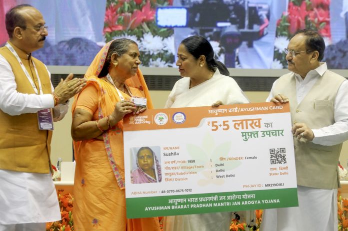 New Delhi: Union Minister of Health and Family Welfare JP Nadda with Delhi Chief Minister Rekha Gupta during distribution of Ayushman Bharat Pradhan Mantri Jan Aarogya Yojana (PM-JAY) health cards, in New Delhi, Thursday, April 10, 2025. An MoU was signed between the Health ministry and Delhi government to implement the scheme in the national capital. (PTI Photo)(PTI04_10_2025_000202B)