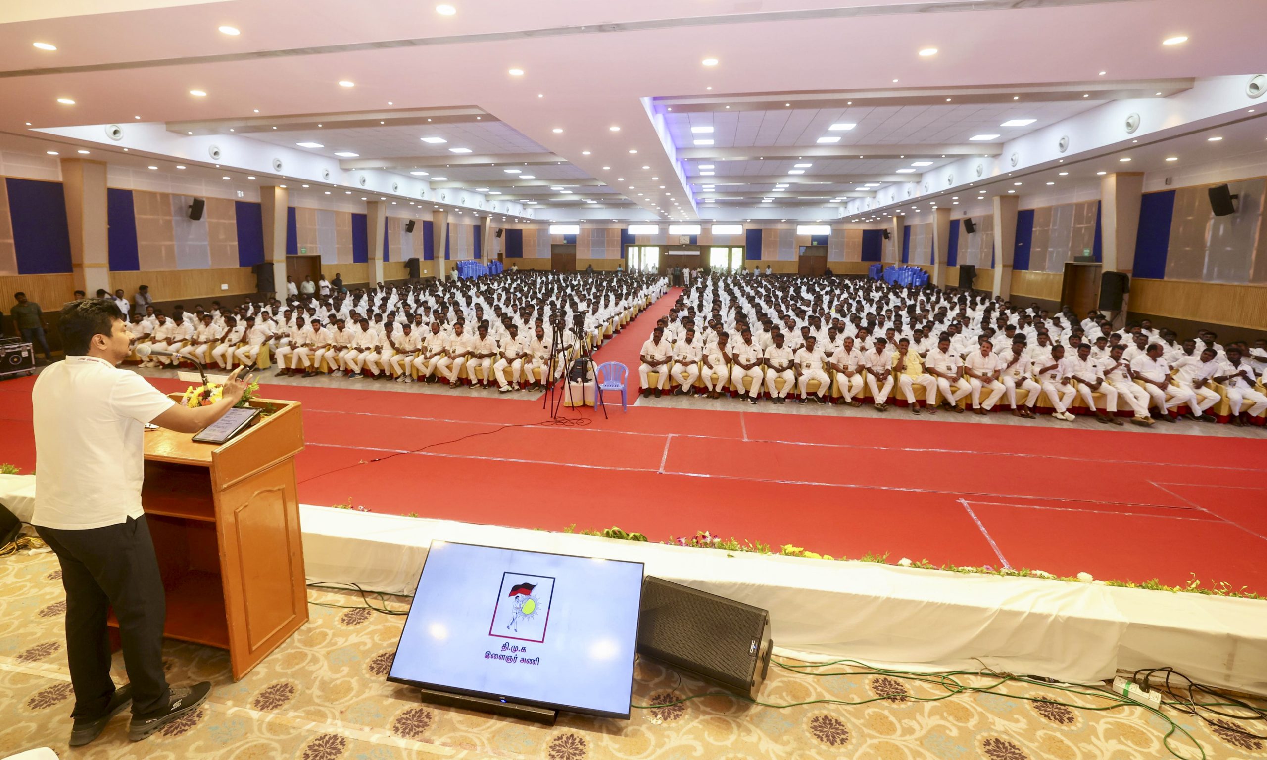 **EDS: THIRD PARTY IMAGE** In this image posted on March 24, 2026, Tamil Nadu Deputy Chief Minister and State Youth Secretary Udhayanidhi Stalin with others during DMK Youth Wing Executives’ meeting, in Madurai. (@Udhaystalin/X via PTI Photo) (PTI03_24_2026_000318B)