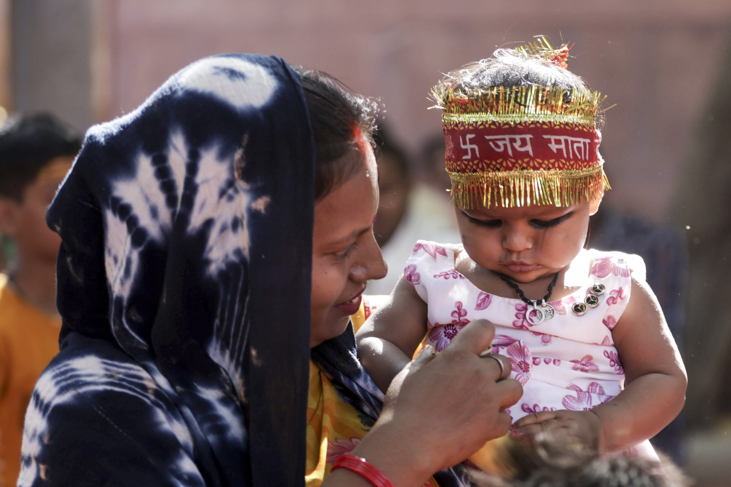 Prayagraj: A woman with a child at the ‘Alopi Shankari Devi Shakti Peeth Mandir’ on the occasion of ‘Durga Ashtami’ festival, in Prayagraj, Uttar Pradesh, Thursday, March 26, 2026. (PTI Photo)(PTI03_26_2026_000056B)