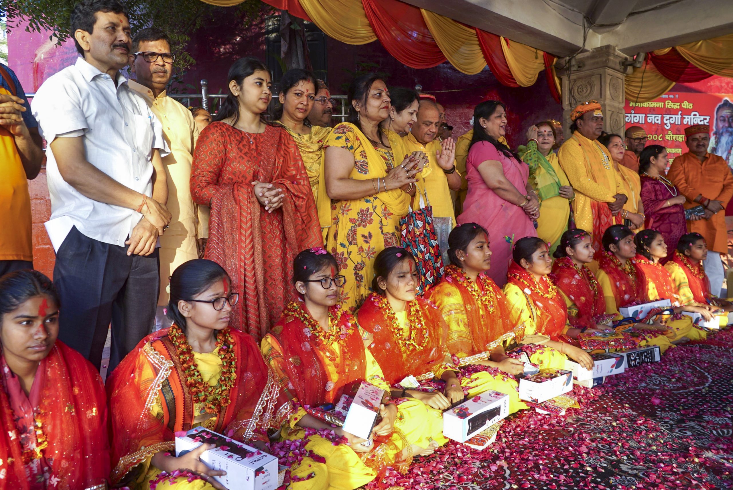 Varanasi: Members of the Subah-e-Banaras Committee pose after performing ‘Kanya Pujan’ on the occassion of the ‘Durga Ashtami’ festival, at Assi ghat in Varanasi, Uttar Pradesh, Thursday, March 26, 2026. (PTI Photo)(PTI03_26_2026_000148B)