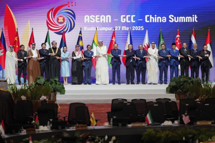 From left, Secretary General of the Gulf Cooperation Council (GCC) Jasem Albudaiwi, Myanmar's Permanent Secretary of the Ministry of Foreign Affairs Aung Kyaw Moe, Qatar's Minister of Commerce and Industry Faisal bin Thani bin Faisal Al Thani, Singapore's Prime Minister Lawrence Wong, Oman's Deputy Prime Minister for Relations and International Affairs Sayyid Asaad Tariq Taimur Al Said, Thailand's Prime Minister Paetongtarn Shinawatra, Saudi Arabia's Foreign Minister Prince Faisal bin Farhan al-Saud, Philippines' President Ferdinand Marcos Jr., Kuwait's Crown Prince Sheikh Sabah Khaled al-Hamad al-Sabah, Malaysia's Prime Minister Anwar Ibrahim, China's Premier Li Qiang, Brunei's Foreign Minister Erywan Yusof, Ruler of the UAE's Emirate Ras al-Khaimah Sheikh Saud bin Saqr al Qasimi, Cambodia's Prime Minister Hun Manet, Indonesia's Foreign Minister Sugiono, Laos' Prime Minister Sonexay Siphandone, East Timor's Prime Minister Xanana Gusmao, and ASEAN Secretary-General Kao Kim Hourn pose for a group photo at the ASEAN - Gulf Cooperation Council (GCC) - China Summit after the Association of Southeast Asian Nations (ASEAN) Summit in Kuala Lumpur, Malaysia, Tuesday, May 27, 2025. AP/PTI(AP05_27_2025_000170B)