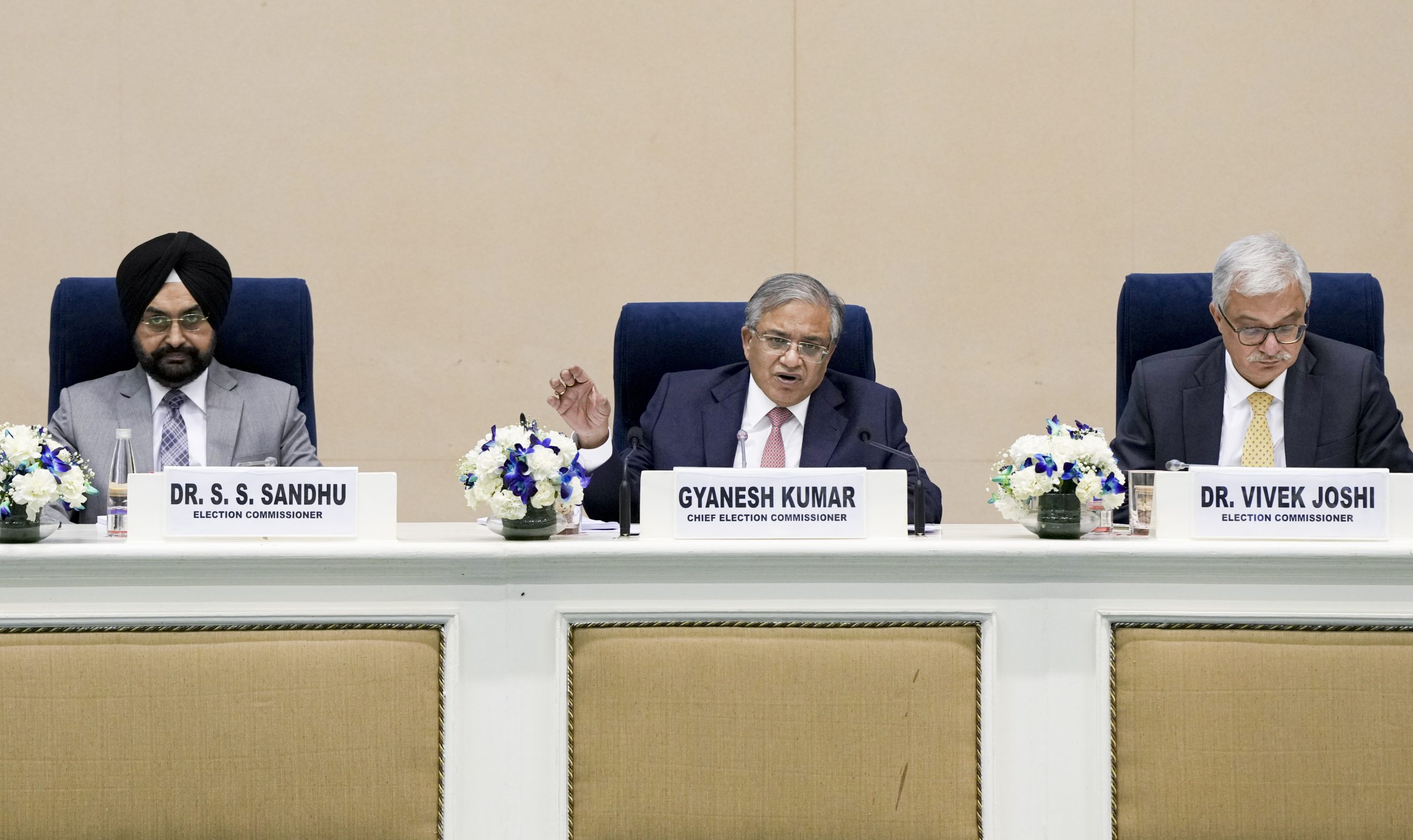 New Delhi: Chief Election Commissioner Gyanesh Kumar, centre, with Election Commissioners S S Sandhu, left, and Vivek Joshi during a press conference to announce the Assembly election schedule for West Bengal, Tamil Nadu, Kerala, Assam and Puducherry, at Vigyan Bhawan in New Delhi, Sunday, March 15, 2026. (PTI Photo/Arun Sharma) (PTI03_15_2026_000235B) *** Local Caption ***