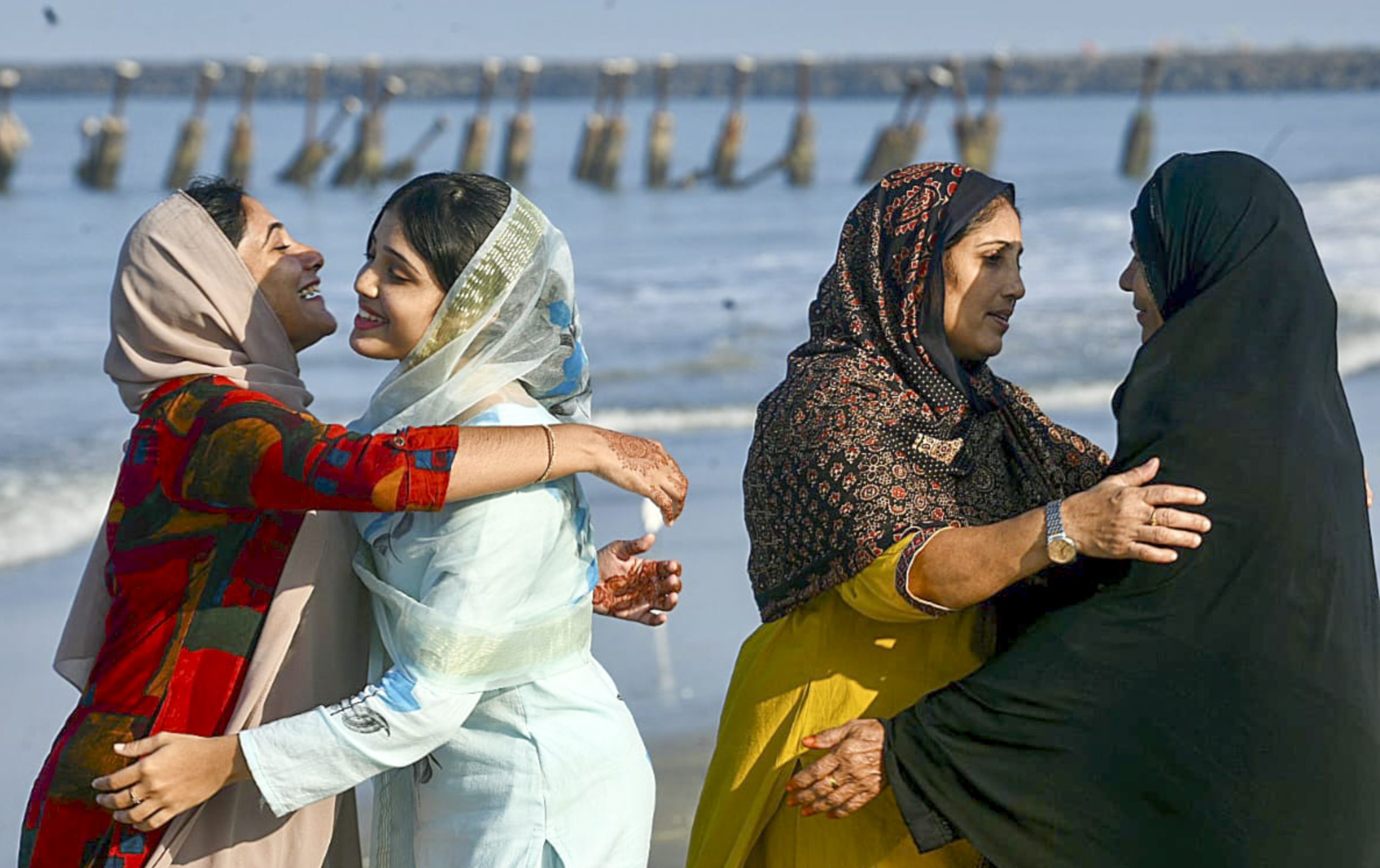 Kozhikode: Women greet each other at an Eidgah as part of Eid al-Fitr celebrations, at Kozhikode beach, in Kerala, Friday, March 20, 2026. (PTI Photo)(PTI03_20_2026_000045B)