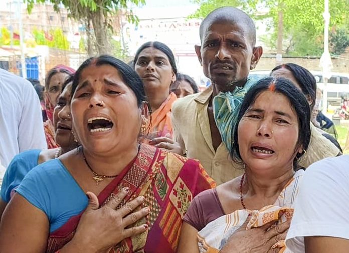 Bihar Sharif: Family members of victims mourn outside a hospital after a stampede at the Sheetla Mata temple killed at least eight devotees and injured eight, in Bihar Sharif, Nalanda district, Tuesday, March 31, 2026. (PTI Photo) (PTI03_31_2026_000250B) *** Local Caption ***