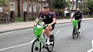 Both sides got stuck on their team buses on the way to the Oval in south London, with England’s players deciding to get off and ride bikes to the ground instead.