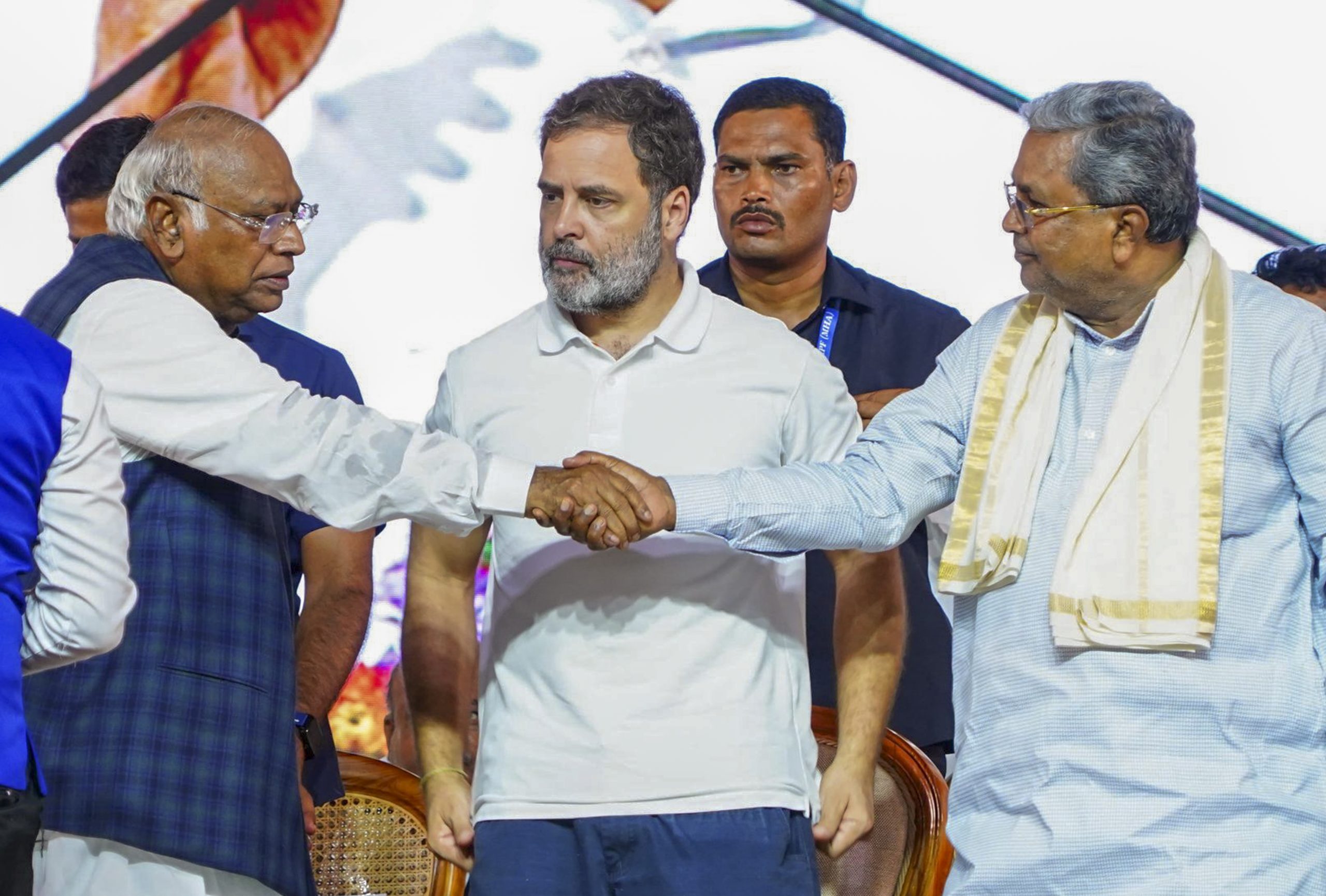 **EDS: THIRD PARTY IMAGE** In this image released by @siddaramaiah via X on May 20, 2025, Congress President Mallikarjun Kharge with LoP in the Lok Sabha and party leader Rahul Gandhi, and Karnataka Chief Minister Siddaramaiah during an event to mark the state Congress government's two years in office, in Hosapete, Karnataka. (@siddaramaiah via PTI Photo)(PTI05_20_2025_000256B)