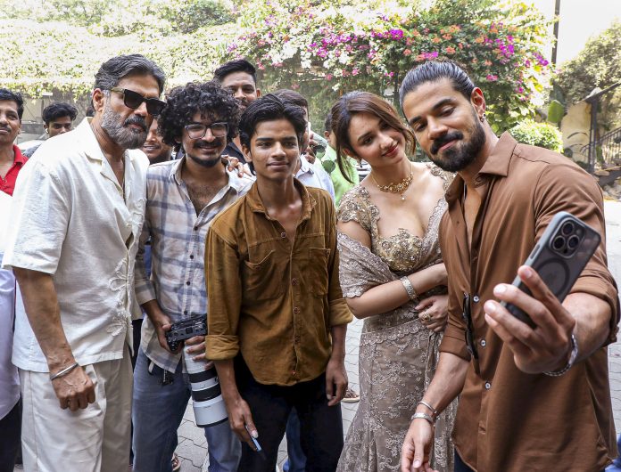 Mumbai: Bollywood actors Suniel Shetty, Sooraj Pancholi and Akanksha Sharma take a selfie with others during the promotion of their upcoming film ‘Kesari Veer’, in Mumbai, Maharashtra, Wednesday, April 30, 2025. (PTI Photo) (PTI05_01_2025_000012B)