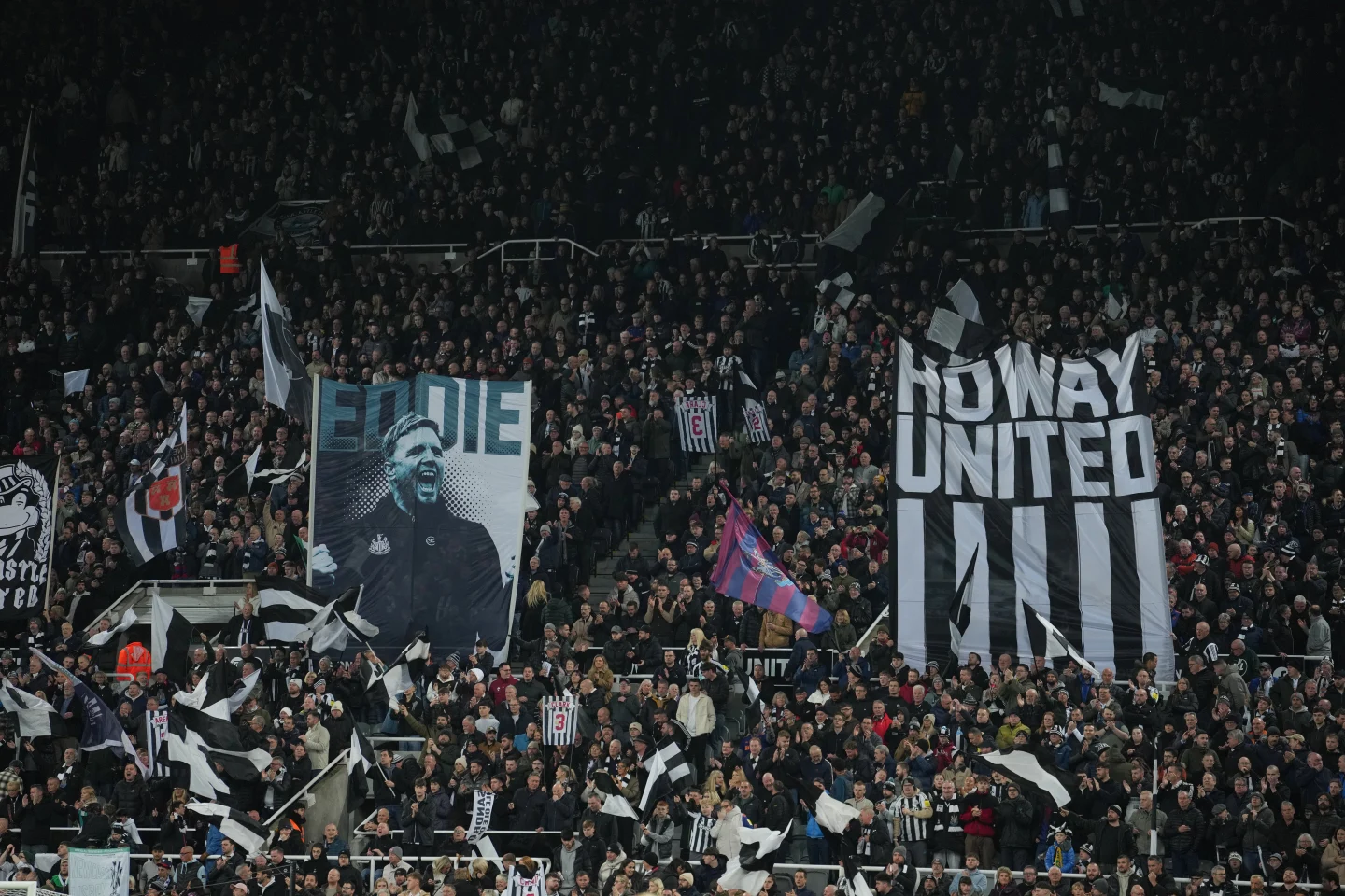 Fans hola a poster of Newcastle’s head coach Eddie Howe during a Premier League soccer match between Newcastle United and Manchester City in Newcastle, England, Saturday, Nov. 22, 2025. (AP Photo/Jon Super)