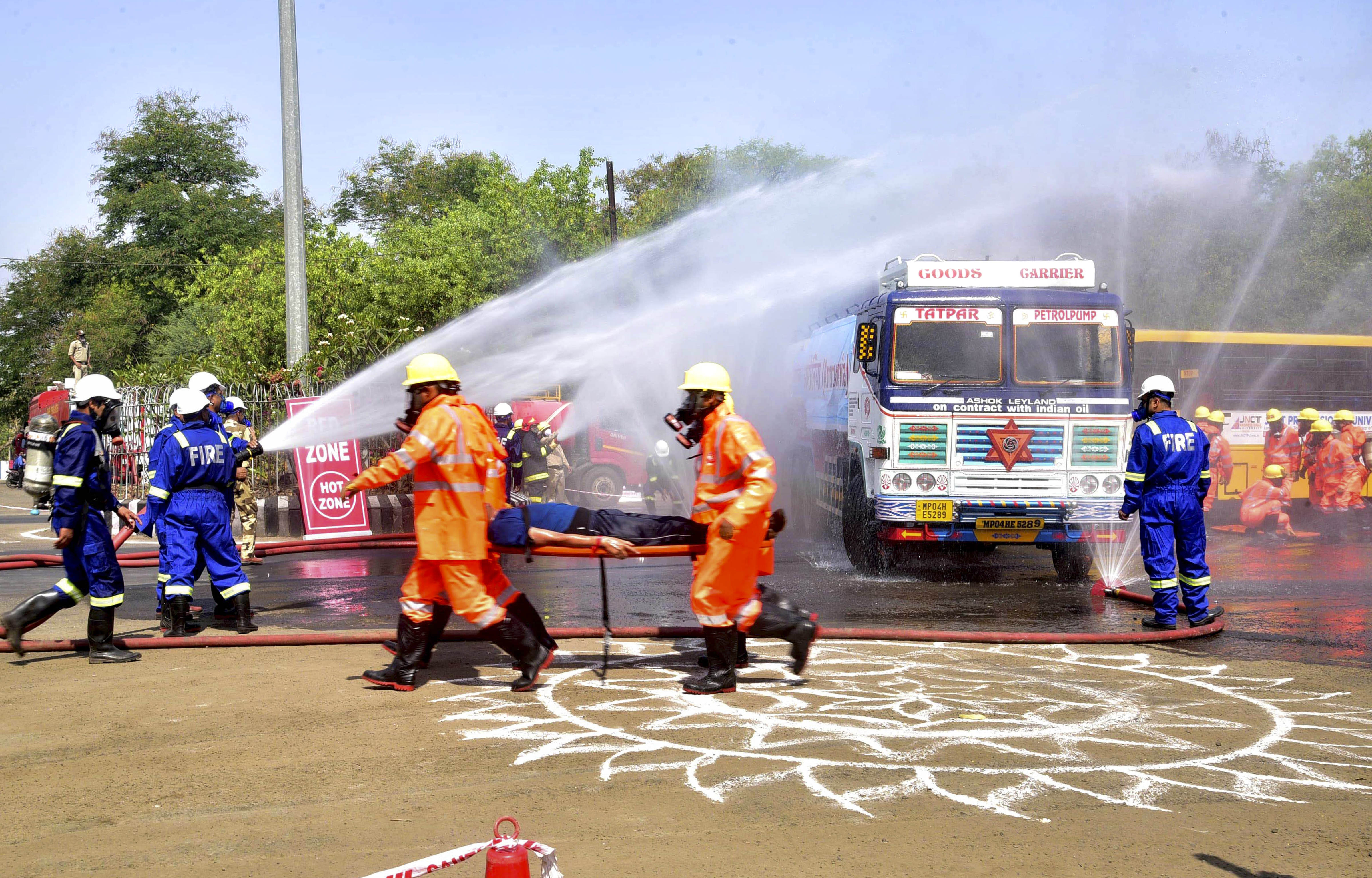 Bhopal: Firefighters carry out a mock drill for a chemical industrial disaster jointly conducted by the National Disaster Management Authority (NDMA) and State Disaster Management Authority (SDMA), at Central Power Research Institute, BHEL, in Bhopal, Thursday, April 17, 2025. (PTI Photo) (PTI04_17_2025_000184B)