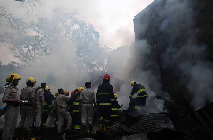 Patna: Firefighters try to douse a fire that broke out at a sawmill warehouse, in Patna, Monday, April 14, 2025. (PTI Photo)(PTI04_14_2025_000015B)