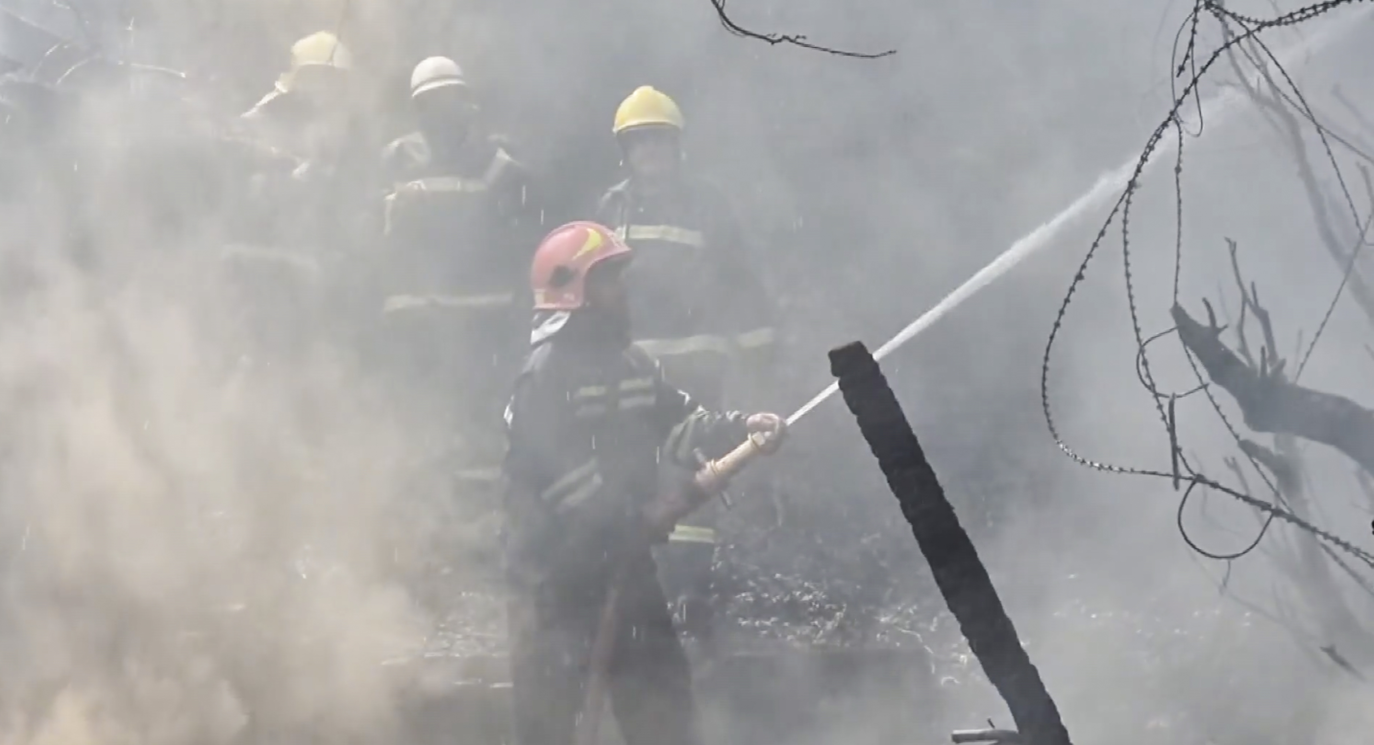 EDS: SCREENSHOT VIA PTI VIDEOS** Srinagar: Firefighters try to douse a fire that broke out near the PDP office, in Srinagar, Monday, April 7, 2025. (PTI Photo) (PTI04_07_2025_000049B)