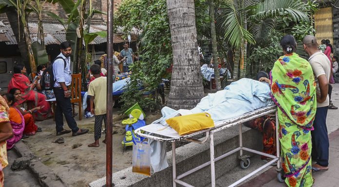 Patna: Patients and attendants gather outside a nursing home after a fire breaks out on the fourth floor of the building, in Patna, Wednesday, April 1, 2026. (PTI Photo)(PTI04_01_2026_000591B)