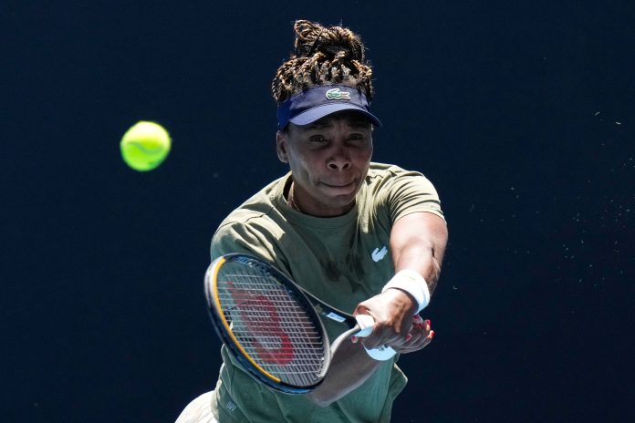 Venus Williams of the United States plays a backhand return during a practice session ahead of the Australian Open tennis championship in Melbourne, Australia, Saturday, Jan. 17, 2026. (AP/PTI) (AP01_17_2026_000010B)