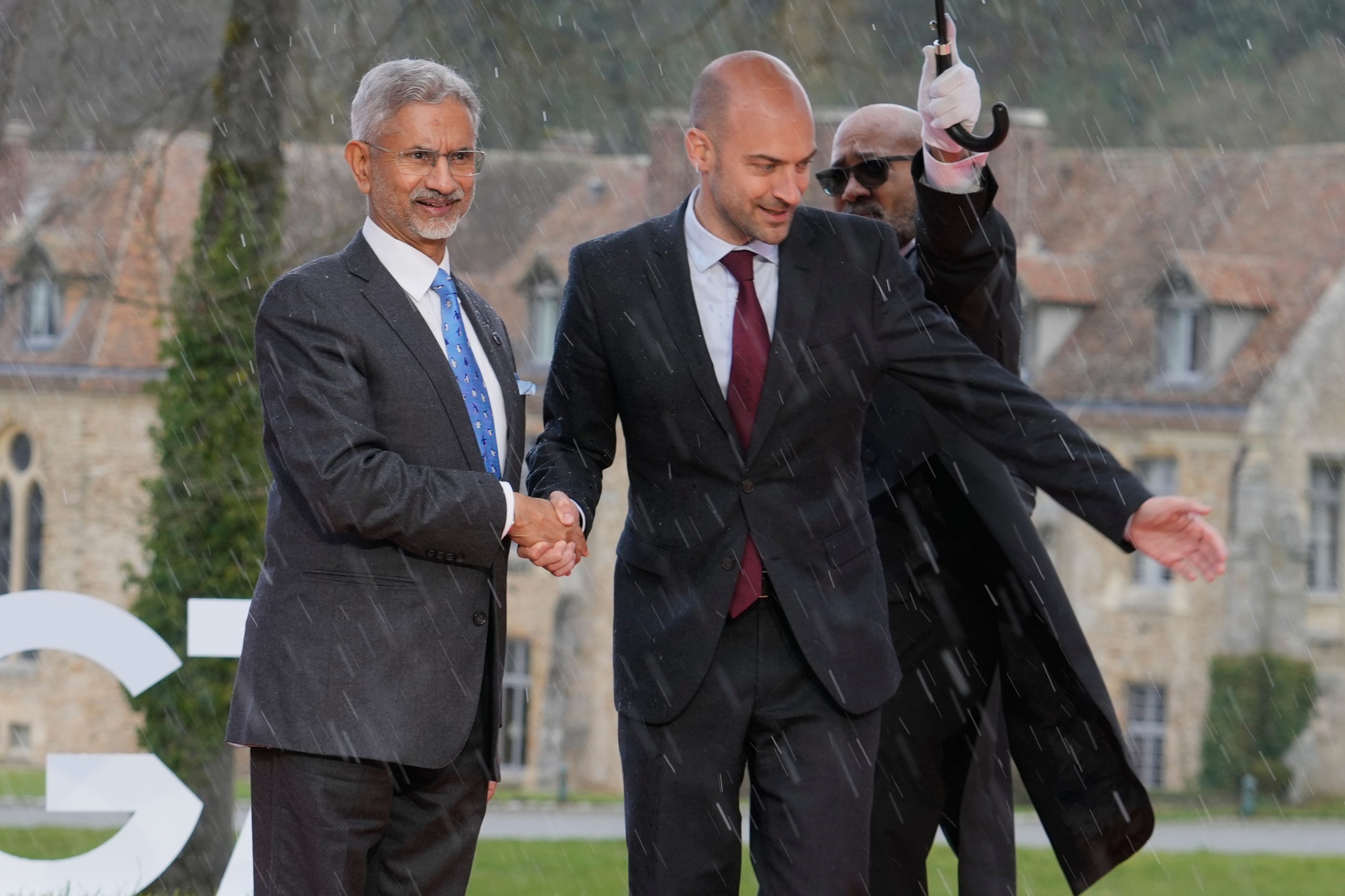 France’s Foreign Affairs Minister Jean-Noel Barrot, front right, greets India’s Foreign Minister Subrahmanyam Jaishankar, left, as he arrives at the G7 Foreign Ministers’ meeting with partner countries in Cernay-la-Ville outside Paris, France, Thursday, March 26, 2026. AP/PTI(AP03_26_2026_000394B)