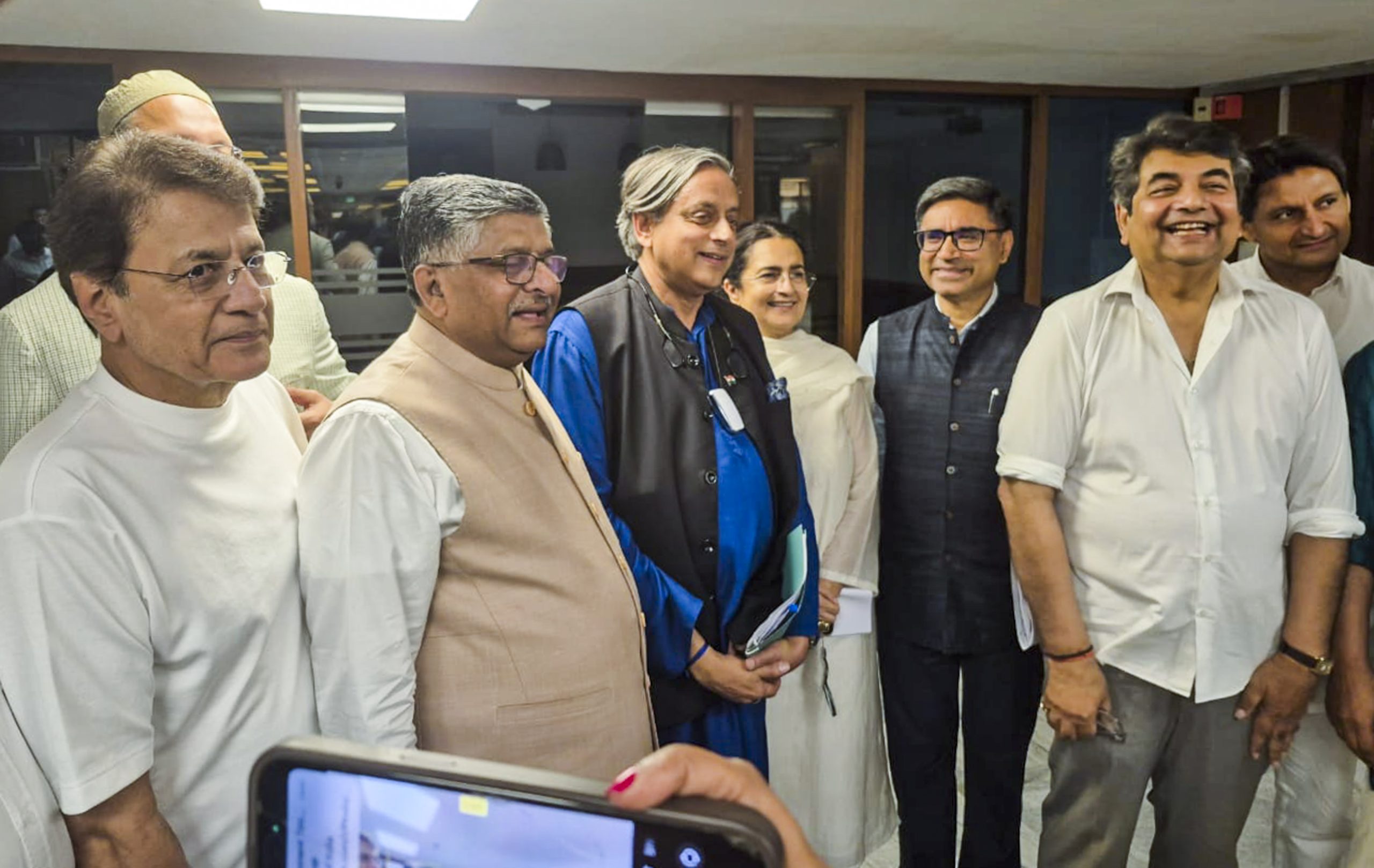 New Delhi: Parliament's Standing Committee on External Affairs Chairperson, Congress MP Shashi Tharoor with AIMIM chief Asaduddin Owaisi, BJP's RPN Singh, Ravi Shankar Prasad and other members, and Foreign Secretary Vikram Misri, after a meeting of the committee, in New Delhi, Monday, May 19, 2025. (PTI Photo/Kumar Rakesh) (PTI05_19_2025_000289B)