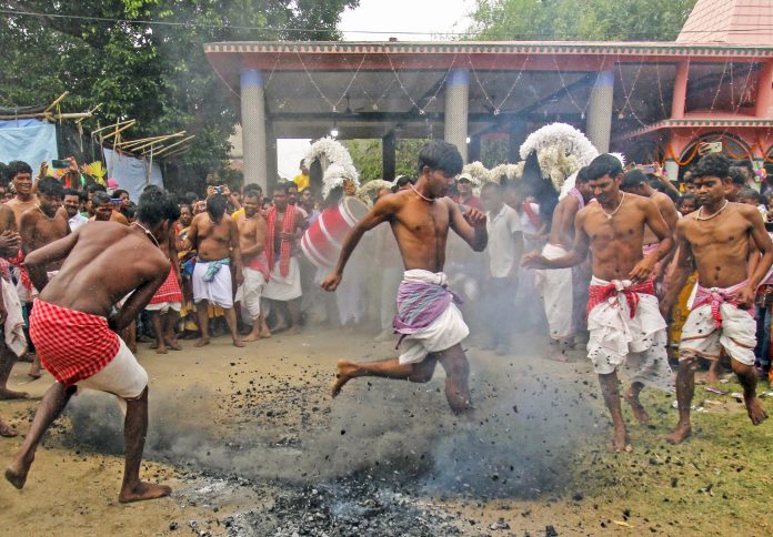 Birbhum: Gajan sanyasis dance on burning charcoal in front of the Dharmaraj temple as part of their rituals to seek blessings of the god through pain during the Gajan festival, in Birbhum district of West Bengal, Saturday, April 12, 2025. (PTI Photo) (PTI04_12_2025_000096B)