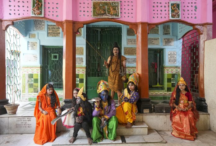 Kolkata: Artists dressed as Hindu deities during the Shiva Gajan festival celebrations, in Kolkata, West Bengal, Sunday, April 13, 2025. (PTI Photo/Swapan Mahapatra)(PTI04_13_2025_000343B)