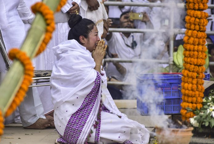 Guwahati: Garima Saikia Garg, wife of singer Zubeen Garg, mourns during his funeral, on the outskirts of Guwahati, Tuesday, Sept. 23, 2025. Zubeen Garg died while scuba diving in Singapore. (PTI Photo)(PTI09_23_2025_000314B)